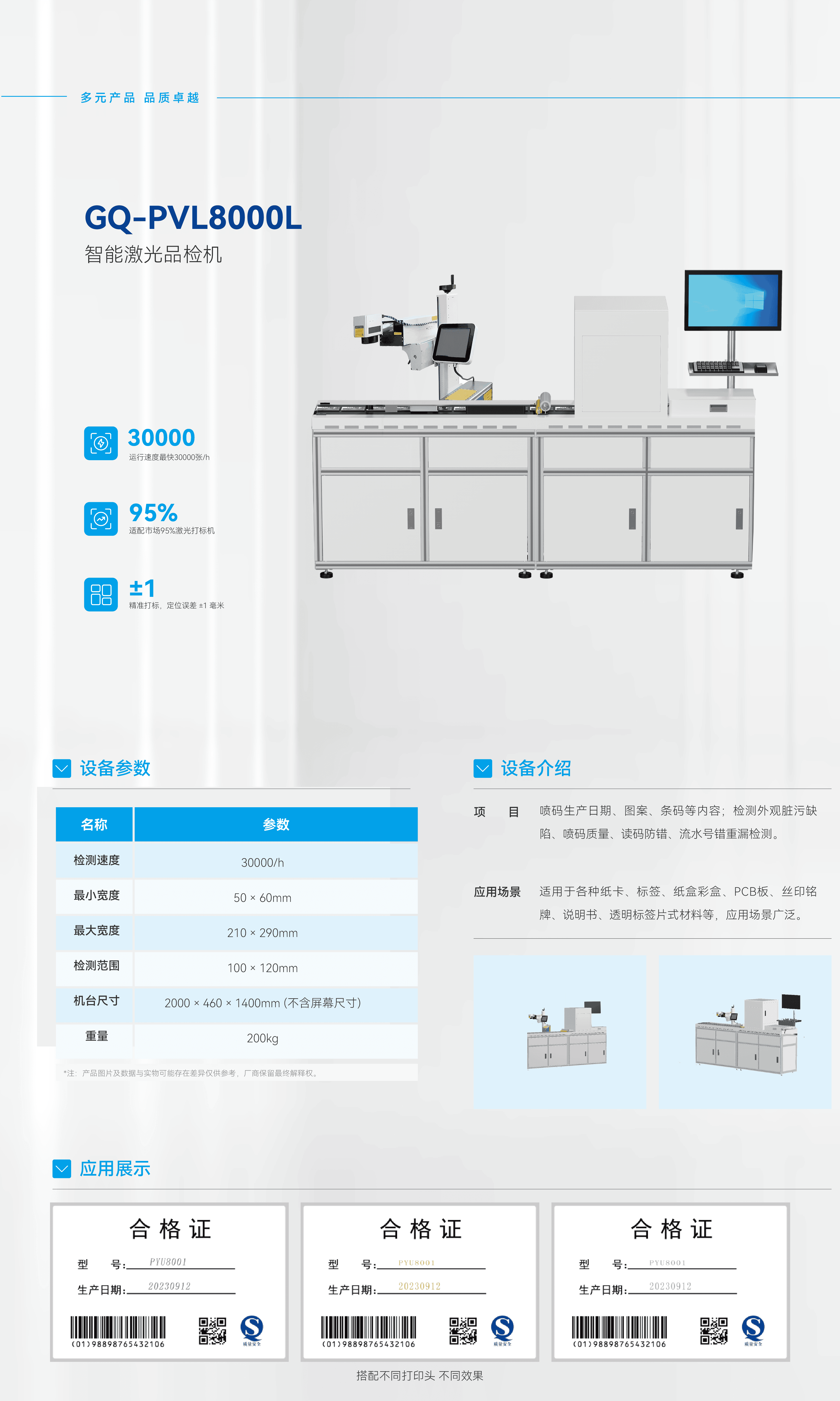 - 技術參數 產品名稱:PVL8000L 智能激光品檢機核心特點: 檢測速度:30,000件/小時檢測準確率:95%定位精度:±1厘米支持多元產品檢測(紙……
